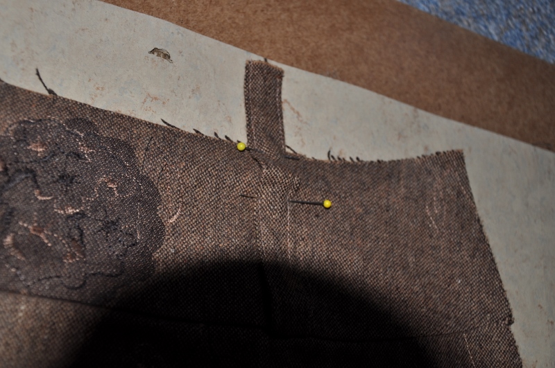 Nahtzugabe umklappen, Schlaufe mit umklappen, am Rand der Zugabe feststecken. Durch das Umklappen legt ihr die Mehrweite fest, die die Schlaufe braucht, damit sie hinterher nicht spannt.