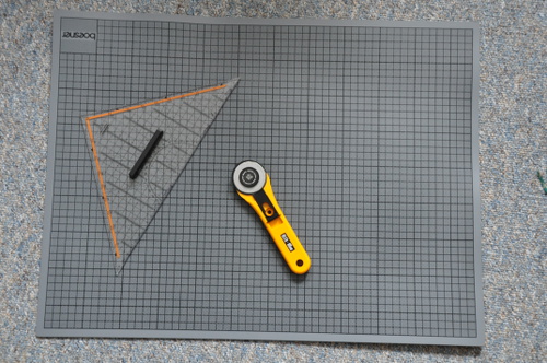 Jetzt ist das Zuschneiden dran. Die Waffe der Wahl ist dabei der Rollschneider mit spezieller Schneidematte (die besten sind selbst-verschließend). Schneidematten bekommt man im Patchwork-Bedarf, genau so wie Rollschneider und Klingen, aber im Fachversand für Künstlerbedarf gibt es sie oft günstiger.DSC_1330