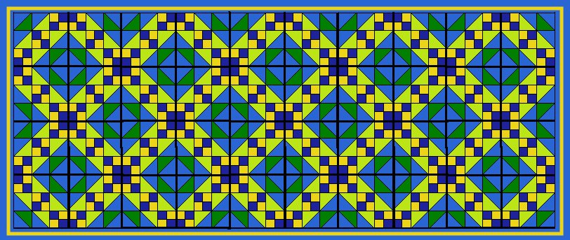Im Vergleich zum Einzelblock habe ich blau und grün vertauscht, weil die grüne Variante meinem Mann nicht gefiel. Dummerweise sieht das Muster nur mit einer geraden Anzahl von Reihen bzw. Spalten gut aus, daher darf ich jetzt also 40 anstelle von 36 Blöcken nähen, man gönnt sich ja sonst nichts.