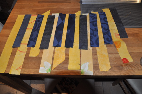 Streifen zusammennähen und in kleine Abschnitte zerschneiden. Dann zu Quadraten zusammensetzen.