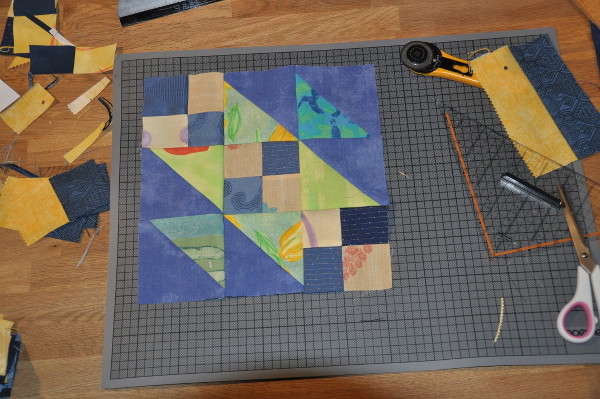 Die Farben bleiben grundsätzlich so, wie sie sind. Aber wie Du schon gesehen hast, sind die Streifen für die kleinen Quadrate kräftiger, d.h. das Blau ist dunkler und das Gelb lebhafter. Im ersten Block ist der Kontrast zum Hellgrün bzw. zum Blau der Dreiecke zu gering. Die grünen Dreiecke, die nicht direkt an die kleinen Quadrate grenzen, sollen etwas dunkler, aber durchaus gemustert sein, ich will ja Reste verwerten :). Das Blau der Dreiecke ist ja praktisch schon uni, ich denke das bringt genug Ruhe in den Quilt. Grün mag ich eigentlich sehr gern und unser Wohnzimmer hat eine grüne Wand also sollte im Quilt auch etwas grün vorhanden sein. Wie weit ich in den nächsten drei Wochen komme, hängt vom Wetter ab – der Garten muss winterfest gemacht werden, und vom noch zu nähenden Geschenk für die Tochter, die in knapp zwei Wochen Geburtstag hat, aber hier ist ein Regenwochenende angesagt, also steigt auch bei mir die Hoffnung.