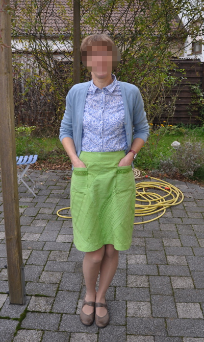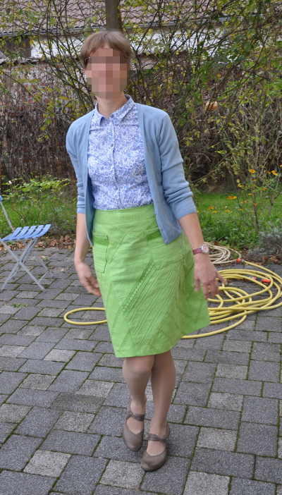 DSC_0285Es handelt sich hier um einen Rock, für den ich zu Wiederholungstäterin werde: Norma aus der Ottobre 5/2010. Zugeschnitten hatte ich eine 38, aber nach dem Anpassen ist es wohl eine 36 geworden. Der Schnitt ist unterhalb des Formbundes relativ stark gerundet, bei meiner eher flachen Hüftlinie habe ich also die Seitennaht gerader gemacht. Ein weiteres Stöffchen liegt hier schon auf Halde für eine weitere Norma.