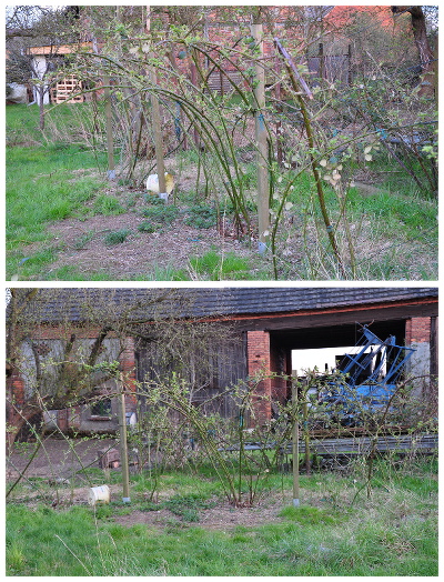 Für mich bedeutet die Forsythien-Blüte Zeit für den Schnitt der Rosengewächse. Dazu zählen nicht nur die Rosen, von denen ein Haufen im Garten herumsteht, sondern ganz besonders der Schnitt der Brombeeren, die wir am Spalier ziehen.