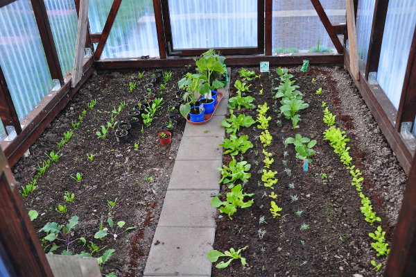 Im Gewächshaus wachen die Radieschen, Pflücksalate, Salatköpfe Kohlrabi und Spinat.