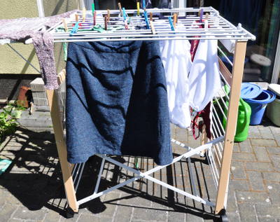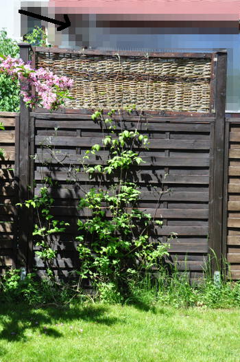 Ein Zaunfeld erhöhen (beim Pfeil ist eine Lücke in den Doppelstegplatten bei der überdachten Treppe der interessierten Nachbarin, ehemals mit Ausblick – in meine Küche).