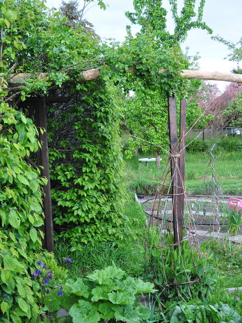 und der rasenmähende Ehemann sich über die herumliegenden Rosenranken beschwert, die bei der Arbeit am Rosenbogen abgeschnitten werden mussten: