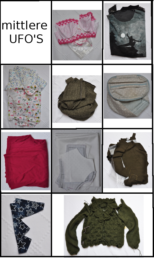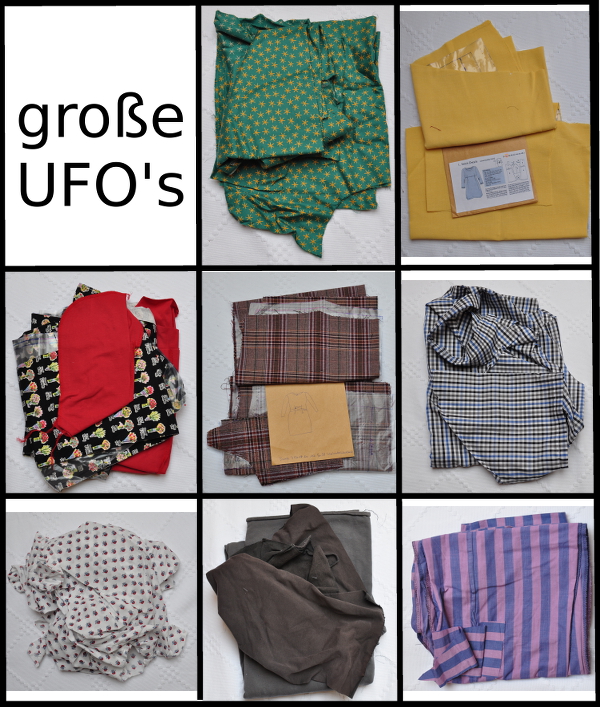 So richtig vorwärtsgekommen bin ich, ehrlich gesagt, ja nicht mit meinen UFO’s. Nachdem ich meine UFO’s Anfang Februar alle aufgelistet habe, bin ich voller Enthusiasmus an die Arbeit gegangen. Tatsächlich habe ich auch ein kleines, ein mittleres und ein großes UFO aufgetrennt. Das kleinere UFO waren die weißen Hemden meines Mannes, mit waschen und bügeln sind sie jetzt fertig. Weiter bin ich dann leider nicht gekommen. Und heute habe ich statt zu nähen die UFO’s noch einmal fotografiert und etwas besser und übersichtlicher in Szene gesetzt.
