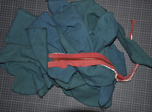 Für’s Erste habe ich den Oberstoff zugeschnitten, und weil die Farbe im Stoff wirklich ziemlich ungleichmäßig ist, sind die abgekettelten Teile mit einer Portion „Tiefseegrün“ in der Waschmaschine. Der Stoff ist bereits zweimal gefärbt worden, bin gespannt, ob er überhaupt noch Farbe annimmt. Der Schnitt (ich erinnere : die Ottobre spricht von einem „City-Mantel“) sieht keinen echten Verschluss sondern nur drei Häkchen vor. Das ist mir aber viel zu kalt, und deshalb habe ich mich für einen Metall-Reißverschluss als Design-Element entschieden. Aktuell ist er noch rot, aber ich hoffe, die Waschung mit „Tiefseegrün“ wird ihn umfärben. Zumindest Polyamid nimmt diese Farbe gut an, ob die RV-Bänder allerdings daraus und nicht aus Polyester sind, weiß ich nicht. Wie man sieht, ist er aus einer alten Jacke recycelt, mal sehen, ob ich da etwas brauchbares bekomme.