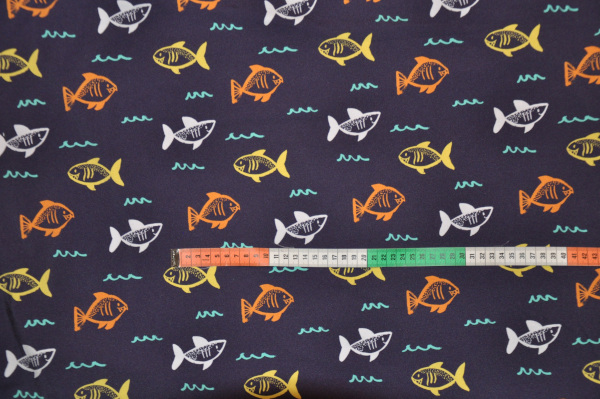 Das Muster heißt „Haifische“, wobei die gelben und orangen Fischchen einer andere räuberischen Spezies angehören. Sind die kleinen orangenen mit dem Überbiss nicht allerliebst? Den Stoff gib es übrigens bei FunFabric.