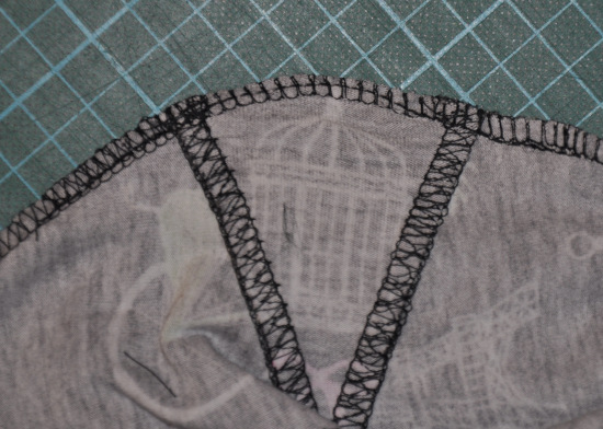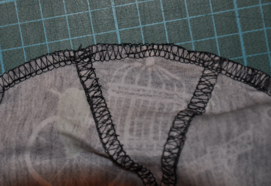 Das beste Ergebnis habe ich erzielt, als ich erst die Naht mit einem 3-fach Geradestich genäht und dann mit einer Overlock auf der Nähmaschine versäubert habe. Dabei habe ich den Stoff zentimeterweise immer wieder glatt gezogen, und dann ging es. Insgesamt habe ich gut 5mm Länge beim Zwickel dabei eingebüßt, und das hat sich vermutlich negativ auf die Passform ausgewirkt.