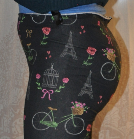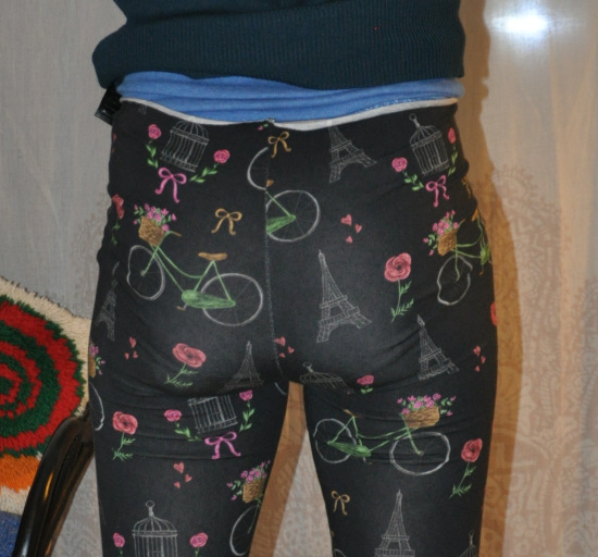 Von vorne sieht die Hose ganz OK aus, vor allem tritt der gefürchtete „Cameltoe“ nicht auf. Die Seitenansicht offenbart aber, dass ich an der Rückwärtigen Mitte noch einiges an Stoff dazugeben muss. Obwohl ich den Schnitt nach meinem Hüftumfang ausgewählt habe, fehlt da etwas. Da mein Po sehr kräftig ist, ist die hintere Schrittnaht zu kurz. Die Taille fällt hinten ab. Außerdem steht in der Taille der Stoff ab, da muss was weg. Die gestresste Mittelnaht und der helle Glanz auf den Pobacken zeigen an, dass hier der Stoff zu stark gedehnt wird. Ich habe das mal ausgerechnet: Der Schnitt ist 70.5cm breit auf Gesäßhöhe und wird auf 94cm gedehnt. Das sind 33%! Wenn ich von den 94cm Hüftweite ausgehe, sind das 25% negative (Un-)Bequemlichkeitszugabe, das ist selbst für eine Sporthose zuviel. Mein Haifisch-Jersey sieht auch nicht besonders gut aus, wenn er so viel gesdehnt wird, da muss ich unbedingt nachbessern. Im Prinzip müsste ich einen Keil von 7cm Breite in den Schnitt einarbeiten, ich bin nicht sicher, ob das am Ende überzeugend wird. Verlängern muss ich die Hose auch noch, und zwar auf Höhe der Knie, das wird von Jalie auch so angegeben. Meine Beine sind 6cm länger, als vorgesehen, die will ich unbedingt dazugeben, denn bei Kaufhosen habe ich immer Hochwasser, auch ein Grund, meine eigenen Leggins zu nähen.
