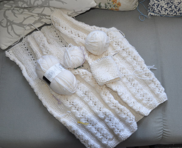 Mein zweites Projekt ist ungefähr so weit wie am Anfang. Das liegt nicht etwa daran, dass ich nicht gestrickt hätte! Mittlerweile habe ich den einen Ärmel zum dritten Mal auf den Nadeln. Die ersten Versuche waren eindeutig zu weit, und die Wolle ist sehr knapp. Aktuell denke ich darüber nach, zwei weitere Knäuel zu bestellen und den zweiten Ärmel mit neuer Wolle zu stricken. Wie groß kann die Farbabweichung bei weißer Wolle wohl sein?