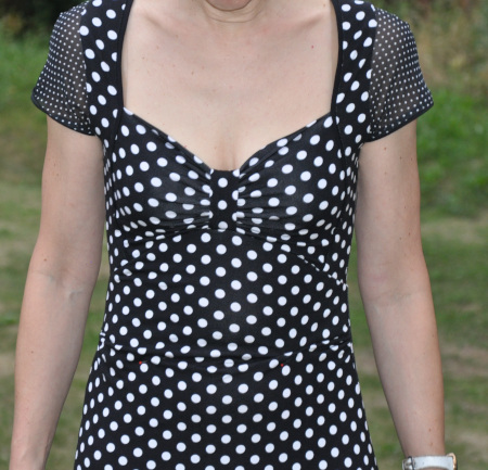 Im Grunde gefällt mir auch der Chiffon, den ich verwendet habe, viel besser als der Tupfentüll, weil die kleinen weißen Punkte auf dem dunklen Grund viel zarter wirken. Mit dem Gummiband in der Paspel werden die Träger auch besser sitzen. Ich hatte sie etwas eingekürzt, leider kann ich das nicht rückgängig machen, weil ich die Enden abgeschnitten habe.