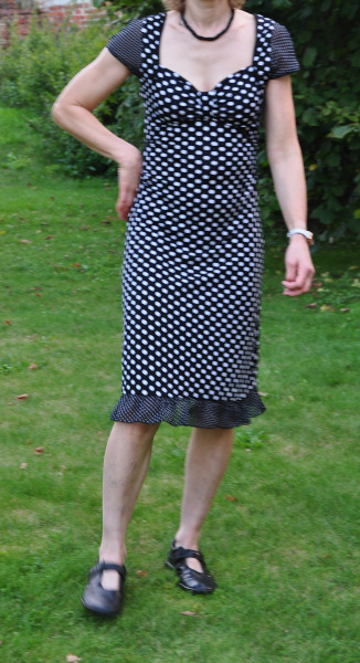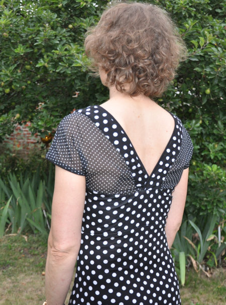 Wenn man das Bild oben sieht, wird auch klar, warum der durchsichtige Stoff elastisch sein sollte: Die gesamte Breite des Rückens ist bei meinem Modell fest, und das schränkt die Beweglichkeit und den Komfort doch ganz schön ein. Ich habe auch gleich einen Tupfentüll nachgekauft, um die Ärmel auszutauschen, der örtliche Stoffladen hatte, was ich in Berlin nicht gefunden habe. Aber ich scheue die Auftrennarbeit und das erneute annähen dieser Ärmel, und das Kleid trägt sich auch so ganz gut.