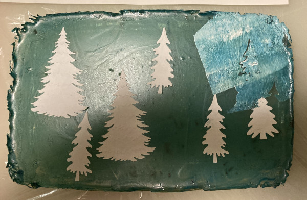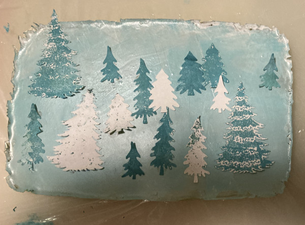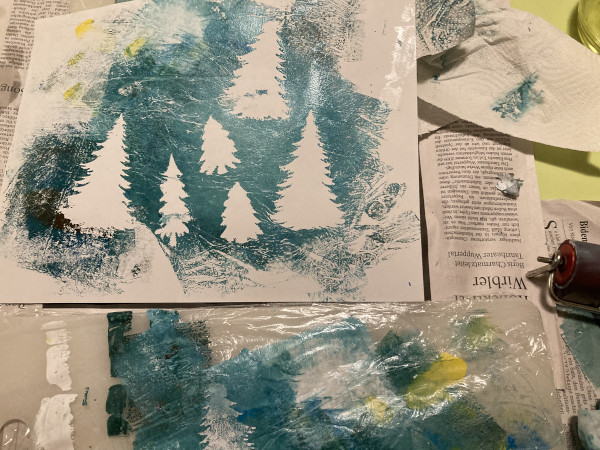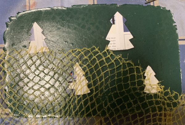Egal, weitergedruckt. Ich wollte Schnee auf meinen Tannen haben. Die Schablone habe ich mit einer Stanze hergestellt. Und links unten seht ihr, was passiert, wenn man nicht rechtzeitig aufhört. Merke: Mehr Druckschichten ergeben nicht zwangsläufig ein besseres Bild.