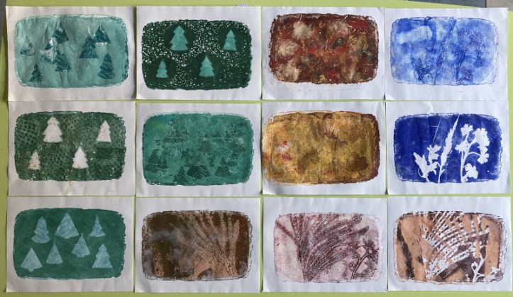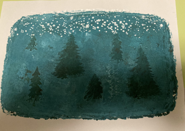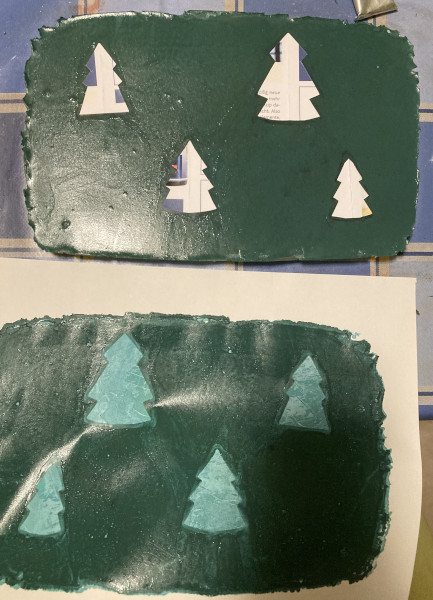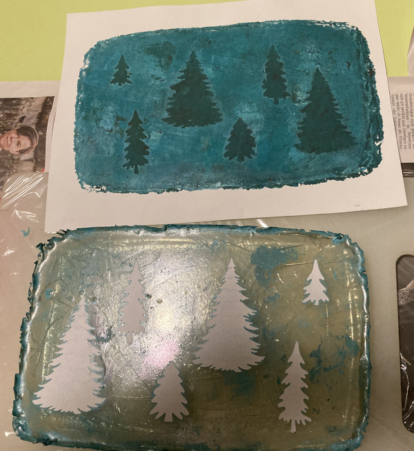 Weiter ging es mit Linoldruckfarbe und Tannenbäumen.
