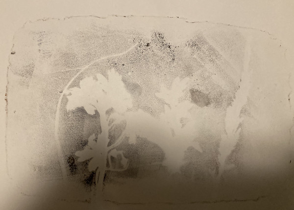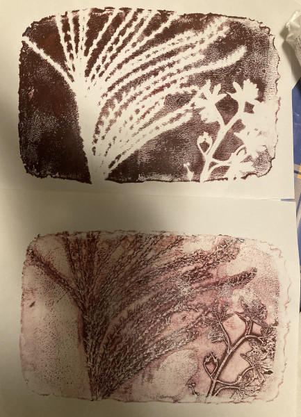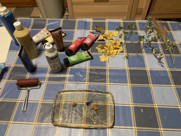 Das hat gar nicht funktioniert, wahrscheinlich war die Farbe zu dünn und ist noch auf der Platte eingetrocknet. Aber warum hat sie sich nicht angelöst und drucken lassen, als ich sie mit Wasser besprüht habe? Bei der Monotypie von der Glasplatte im letzten Jahr hat das doch wunderbar geklappt?!