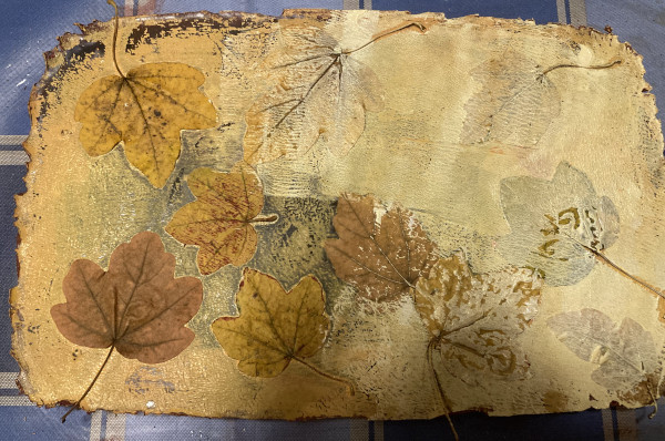 Start mit Acrylfarbe und Gräsern und Blättern.