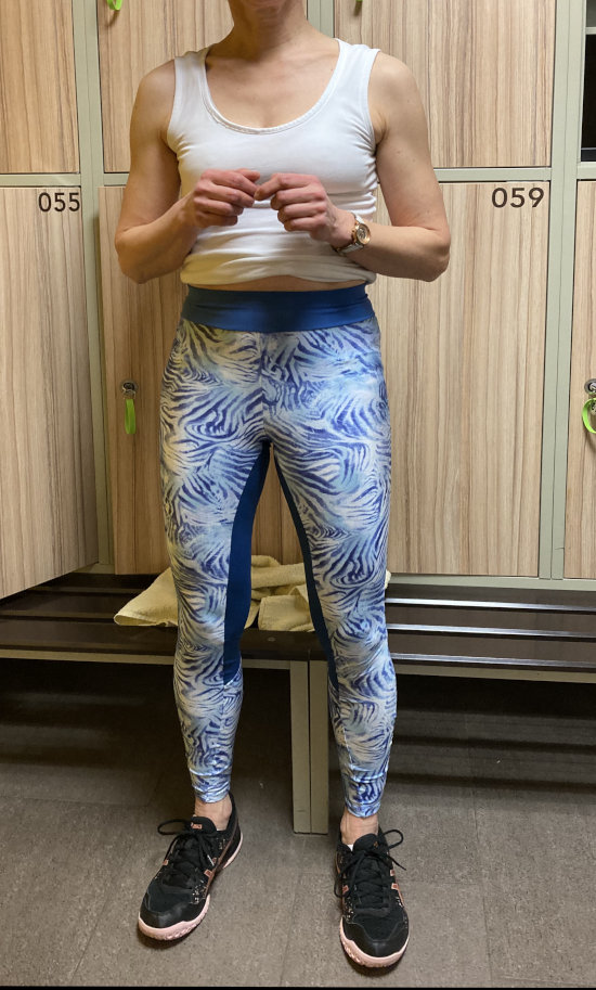Zufrieden bin ich mit der Längenänderung bei dem dunkelblauen Po-Teil. Ich hatte von den Bildern her das Gefühl, dass die Hosennaht mitten auf dem Gesäß landen und unvorteilhaft aussehen würde. Deshalb habe ich die Hose dort um 3cm verlängert, auch um sie auf Taillenhöhe zu bringen. Das hat sich sehr bewährt, die Hose sitzt super ( nachdem ich sie enger genäht hatte). Eine gute Anleitung zur Anpassung von Sportleggins habe ich bei Nähen statt kaufen gefunden.