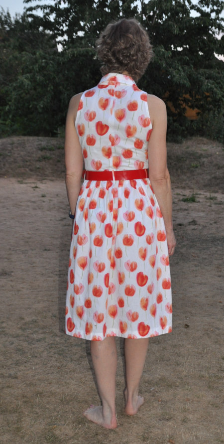 Hinten hat das Kleid eine Teilungsnaht, und dort hätte ich vermutlich an den Schultern mit einem Abnäher eine etwas bessere Passform erzielen können. Weil ich aber immer in Bewegung bin, fand ich diese Arbeit überflüssig.