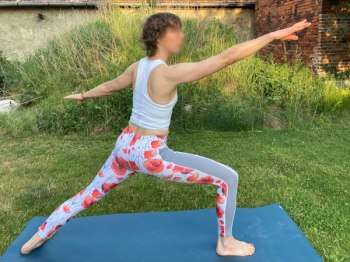 Jalie verlangt 50% Stretch in beide Richtungen für den Jessica-Schnitt. Mit dem Albstoffe-Performance-Jersey bekommt man diese 50% nur mit echter Gewalt hin. In Längsrichtung kommt man sogar nur auf 35%. Nach meiner Erfahrung mit der Mohnblumen-Clara, bei der ich ziemlich genau diese Konstellation hatte, und bei der ich eine Nummer größer genäht habe, habe ich gleich nochmal eine Nummer größer gewählt, und das war sehr gut so. Jalie arbeitet ja mit halben Größen, also habe ich nach „normalen“ Schnittmustern eine Konfektionsgröße größer genäht. Dadurch kann ich mich deutlich besser in der Hose bewegen, bezahle das aber mit ein paar Falten.