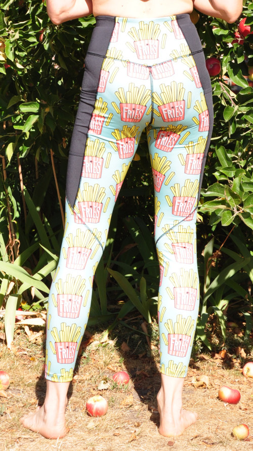 Jessica hat nicht nur große Taschen an den Seiten, in die bequem ein kleines Tablet passen dürfte sondern auch eine ziemlich breite Hüftpasse, die passend zu den Seitentaschen unterteilt ist. Die rückwärtige Passe läuft mittig zu einer Spitze nach unten aus, das betont das Gesäß ziemlich vorteilhaft und gefällt mir sehr gut. Für meine Jessica habe ich den OMG Fries Stoff von Albstoffe performance genommen. Das Ergebnis ist so gruselig, dass es schon wieder gut ist, sagt zumindest mein Geschmack. Das Color-blocking tut dem Fritten-Muster gut, bei anderen Mustern würde ich vermutlich darauf verzichten. Die Musterverteilung war nicht ganz so einfach, man möchte ja keine Monster-Pommestüten auf der Vorder- oder Kehrseite produzieren. Irgendwo häßlich abgeschnitten ist aber auch nicht schön, also habe ich mich für die Variante „eine Tüte für jede Gesäßhälfte“ entschieden.