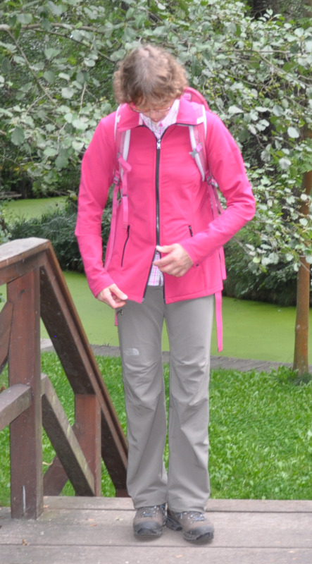 Meine restliche Wanderkleidung ist gekauft, in Manheim bei Oxfam bin ich fündig geworden. Ich hatte damals die Jacke noch nicht fertig, aber die hübsche karierte Bluse (warum sind Wanderblusen eigentlich immer kariert?) passt perfekt zum Himbeerrot der Jacke. Mein Farbgedächtnis hat mich nicht getäuscht. Die Entscheidung für diese kräftige Farbe hat übrigens, neben meiner Freude an kräftigen Farben, auch einen ganz pagmatischen Grund: Wenn man im Gebirge einen Unfall hat, wird man von potentiellen Helfern in einer bunten Jacke einfach besser gesehen als in einem edlen Grau- oder Khaki-Ton.