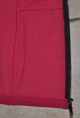 Bei den Taschen habe ich nicht ganz das hinbekommen, was ich wollte, nämlich die Reißverschlüsse in die Teilungsnaht zu integrieren. Ich habe eine Aussparung gamacht, den Reißer eingesetzt und dann sollte das andere Band des Reißverschlusses genau an das Seitenteil genäht werden. Aber leider war die Aussparung zu breit und ich musste einen Streifen einsetzen. Leider habe ich davon kein Detailfoto gemacht. Aber von der Innenseite, auf die ich ziemlich stolz bin: