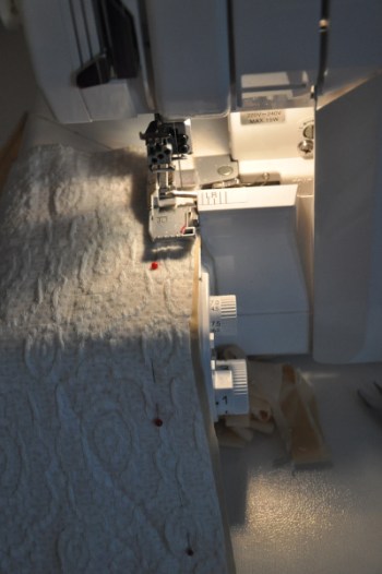 Den Oberstoff zugeschnitten habe ich bereits in der letzten Woche, in bester Gesellschaft, und jetzt habe ich auch endlich das Futter fertig bekommen. Ich habe den Oberstoff einfach auf das Futter gelegt, grob herum ausgeschnitten und dann beide Lagen mit der Ovi zusammengenäht. Jetzt kann ich den gedoppelten Stoff wie eine Lage weiterverarbeiten.
