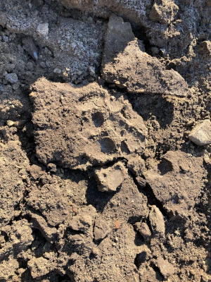 Anfang März gab es nachts noch Fröste und am 1. März, morgens vor der Spätschicht, konnte ich die oberste Schicht Erde in größeren Platten abheben. Darunter war – Überraschung!- ein Stück der Via Appia aus meinem Lateinbuch.