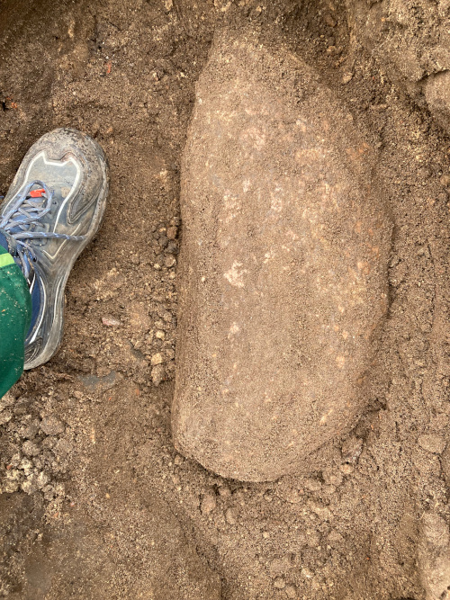 Und dann kam der Freitag Nachmittag. Frohgemut gehe ich in den Garten, um die letzten zwei Meter Rabatte in Angriff zu nehmen. Dann stoße ich in 60cm tiefe auf einen Stein. „Kein Problem“, denke ich, „hast ja schon einige Steine gehoben, den nimmst Du schnell noch raus, bevor Du Feierabend machst!“ Drin bleiben soll der Stein nicht, denn genau an dieser Stelle soll ein Rosenstrauch gepflanzt werden. Ich grabe. Ich mache Feierabend.