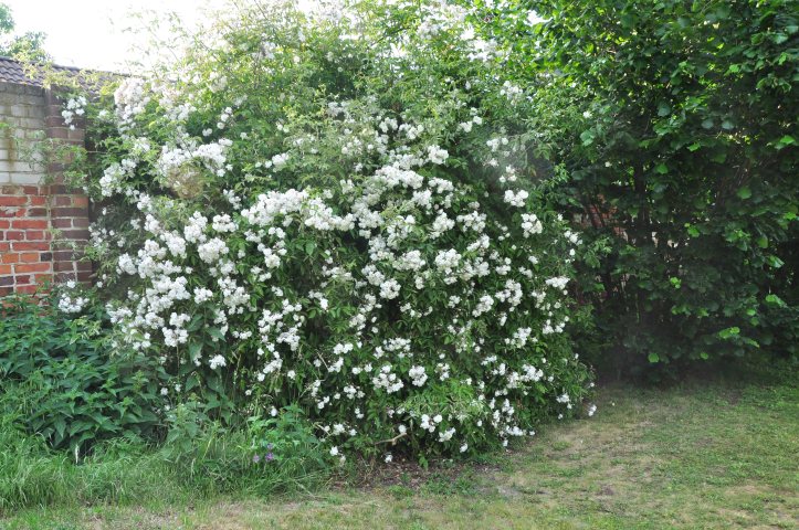 Nachtrag: So hübsch kann die Bobbie James übrigens aussehen, wenn sie mit einer Mauer im Rücken ihre Blütenpracht präsentiert ( und keinen Mehltau hat). Dieses Exemplar bleibt übrigens drin.