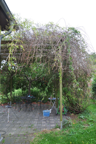 Letzteres ist natürlich meine Schuld, sie hätte schon vor drei Jahren einen Verjüngungsschnitt bekommen müssen, und das Totholz habe ich auch schon seit Jahren nicht mehr herausgeholt. Ich will aber auch keine Rose auf der 3,50m hohen Pergola alle zwei Jahre schubkarrenweise von Totholz befreien müssen. Also wech mit, wie man so schön in meiner Heimat sagt.