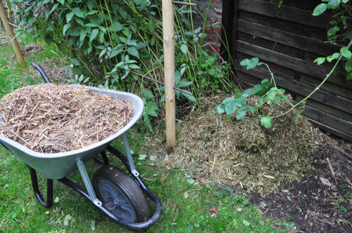 Der Unterschied zu vorher scheint mir nicht allzu groß. Aber nach weiteren anderthalb Stunden am Häcksler (Notiz an mich: unbedingt schärfen lassen), habe ich erstaunliche zwei Schubkarren voller Häcksel, die schnellstmöglich auf die Blumenbeete verteilt werden sollen.