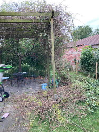 Letzteres ist natürlich meine Schuld, sie hätte schon vor drei Jahren einen Verjüngungsschnitt bekommen müssen, und das Totholz habe ich auch schon seit Jahren nicht mehr herausgeholt. Ich will aber auch keine Rose auf der 3,50m hohen Pergola alle zwei Jahre schubkarrenweise von Totholz befreien müssen. Also wech mit, wie man so schön in meiner Heimat sagt.