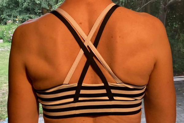 Ein ganz neues Teil ist sogar schon Ende Juli fertig geworden, aber zum Verbloggen fehlte mir die Zeit. Ich habe den Power Sports Bra von Greenstyle Creations zum zweiten Mal genäht. Wieder mit einem Strappy Cross Back, aber dieses Mal mit dem höheren Ausschnitt und einem C-Cup. Der Cup saß auch ganz prima. aber wieder war der gesamte BH zu eng. Und dann kam ich darauf, dass ich mal die Elastizität meines Stoffes mit der Vorgabe vergleichen sollte. Und siehe da, statt der erforderlichen 75% Elastizität haben beide verwendeten Stoffe nur 50%. Wie konnte mir das nur entgehen? Man sollte meinen, ich hätte noch nie mit elastischen Stoffen genäht.