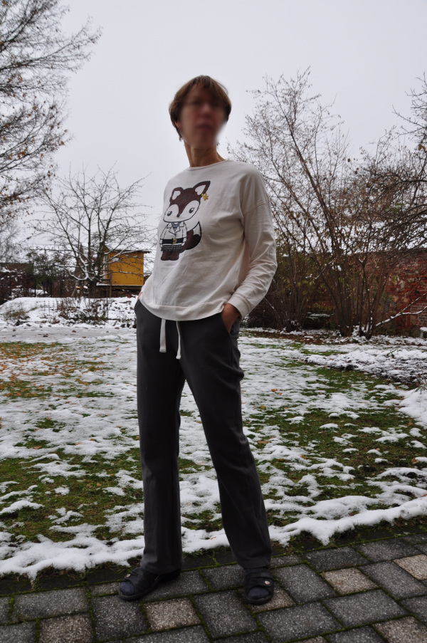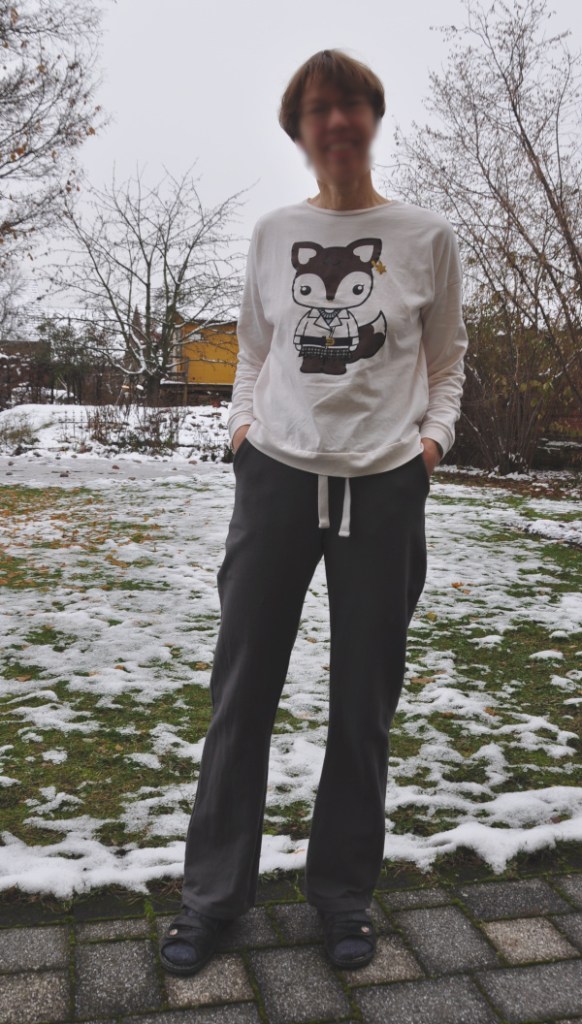 Was gibt es noch zu dem Schnitt zu sagen? Die Hose ist vorne etwas tiefer ausgeschnitten oder hinten etwas höher? Insgesamt führt das dazu, dass vorne keine Stoffmengen vorhanden sind und hinten das Gesäß bequem bedeckt ist. Sie hat einen breiten Rippstrick-Bund mit eingezogenem Gummiband und obendrein einem Bindeband, das ich von der Original-Hose gerettet habe. Ich habe einen bi-elastischen angerauhten Sweat verwendet, vermutlich vom örtlichen Stoffgeschäft, kann aber auch sonstwo gekauft worden sein. Ich liebe sie, und wenn ich eine Möglichkeit fände, damit durchzukommen, würde ich sie überhaupt nicht mehr ausziehen.