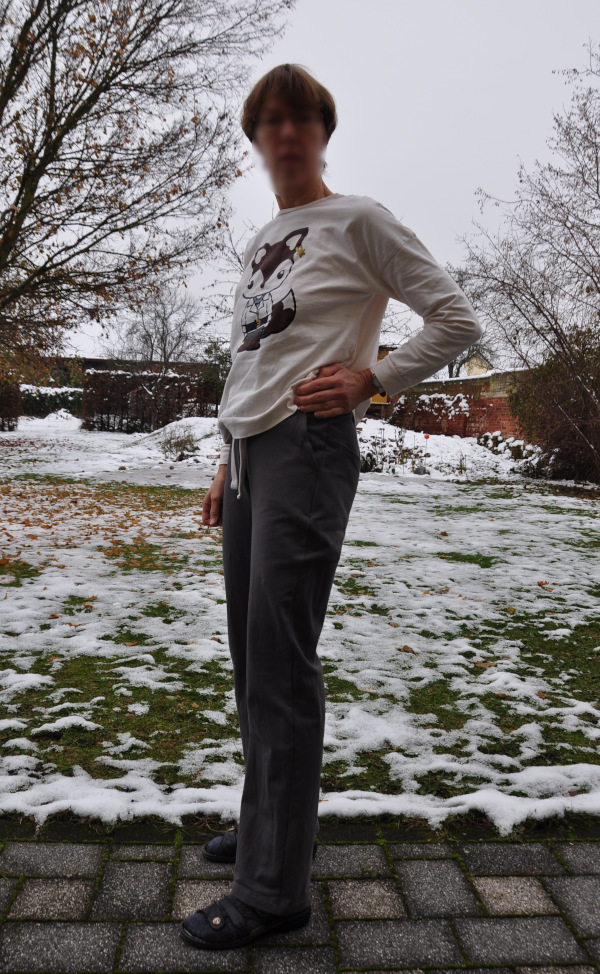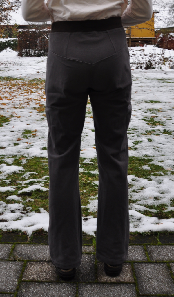 Was gibt es noch zu dem Schnitt zu sagen? Die Hose ist vorne etwas tiefer ausgeschnitten oder hinten etwas höher? Insgesamt führt das dazu, dass vorne keine Stoffmengen vorhanden sind und hinten das Gesäß bequem bedeckt ist. Sie hat einen breiten Rippstrick-Bund mit eingezogenem Gummiband und obendrein einem Bindeband, das ich von der Original-Hose gerettet habe. Ich habe einen bi-elastischen angerauhten Sweat verwendet, vermutlich vom örtlichen Stoffgeschäft, kann aber auch sonstwo gekauft worden sein. Ich liebe sie, und wenn ich eine Möglichkeit fände, damit durchzukommen, würde ich sie überhaupt nicht mehr ausziehen.