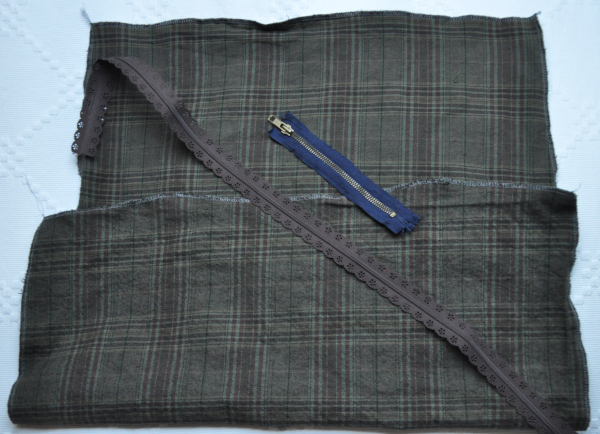 Die Färbung ist gut geworden, aber natürlich kann man die Farbe schwer fotografieren. Von den 8 Fotos, die ich mit unterschiedlichen Belichtungen gemacht habe, ist diese am dichtesten an der Realität, zumindest auf meinem Laptop. Tatsächlich ist der Stoff ein bisschen dunkler und bräunlicher, so dass der Kontrast zum Spitzenreißverschluss sehr viel weniger deutlich ausfällt. Daher überlege ich aktuell, ob ich nicht einen Messingfarbenen Reißverschluss einsetzen will. Vieleicht sogar in 8mm Breite, das wäre ein richtiges Statement. Aber ich weiß nicht, ob so ein breiter Reißverschluss nicht zu steif wäre. In jedem Fall müsste ich auf der Innenseite eine Leiste untersetzen, damit das Metall nicht auf der Haut scheuert und natürlich wäre er Gift für jede Strumpfhose.
