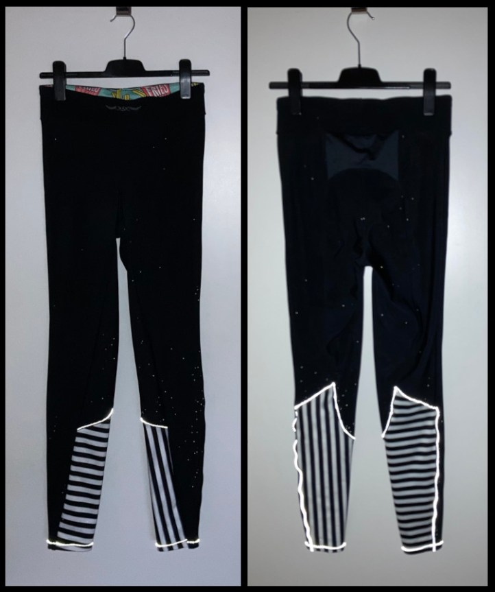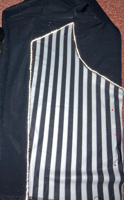 Ebenso ist der Bund mit dünnerem Stoff gedoppelt, hier aber, damit der dicke Thermolycra nicht so aufträgt. Die Hose hat noch eine Besonderheit: Im Winter kann man ja nicht einfach in den Feldern laufen gehen, weil es oft zu dunkel ist. Darum habe ich die Einsätze mit einem reflektierenden Garn abgesteppt. Das klingt jetzt total einfach, aber ich habe stundenlang dafür gebraucht. Ich wollte die Ziernaht covern, aber der Faden brach immer wieder nach einer kurzen Strecke ab. Auch ein Kettenstich brachte kein brauchbares Resultat.