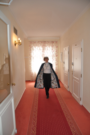 Burda 10/2012#125 im Stil der 1950er Jahre passt sowohl zu dem Oberstoff als auch zum Futter. Von vorne sieht der geschlossene Mantel relativ schmal aus, aber hinten sorgt eine tiefe Kellerfalte für viel Weite und einen wunderschönen Schwung beim drehen. (Und auch für einen meterlangen Saum, den ich auf unserer Reise nach Karlsbad während der gesamten Fahrt von Hand gesäumt habe, puh.)