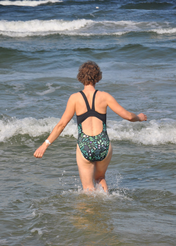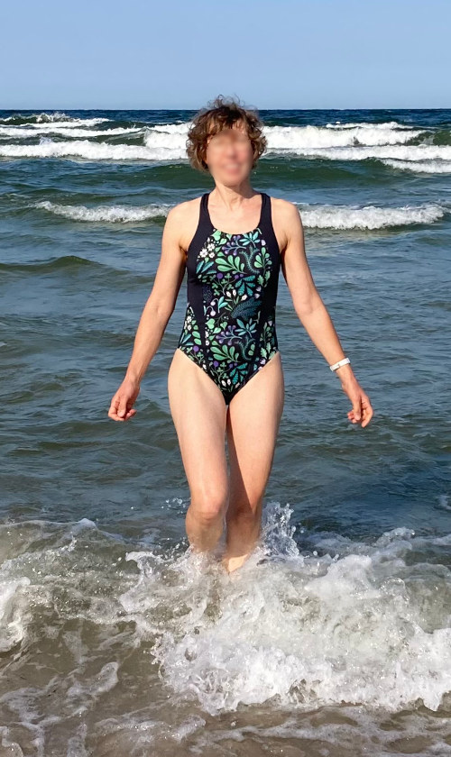 Schwimmen kann man im Streifen-Badeanzug trotzdem sehr gut, (ganz anders als bei meinem ersten Badeanzug-Versuch). Selbst nach 20 Minuten hopsen in der Ostsee-Brandung ist alles an seinem Platz, als ich aus dem Wasser komme. Ein überaus empfehlenswerter Schnitt für Kinder und Frauen, die sportlich schwimmen wollen.