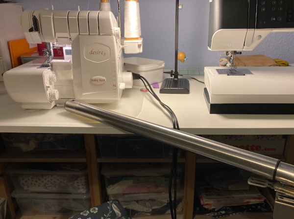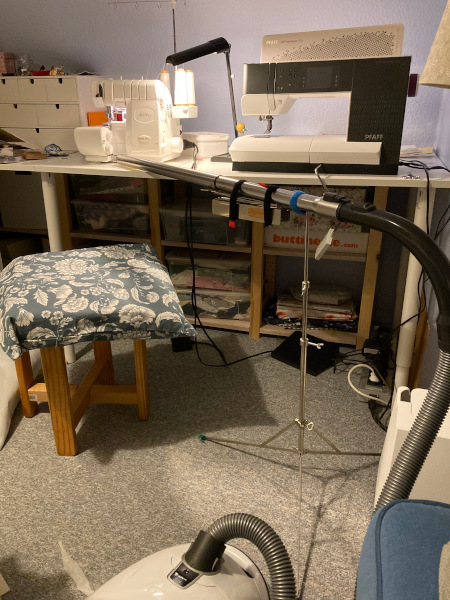 Man nehme einen Staubsauger, einen Notenständer und einige Kabelbinder aus Klettband und fertig ist die Fussel-Absaug-Vorichtung für das Versäubern von Webpelz mit der Ovi.