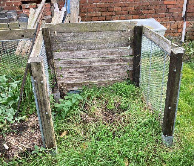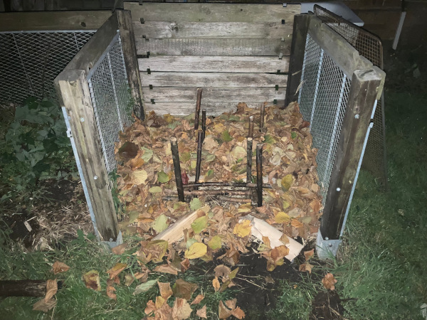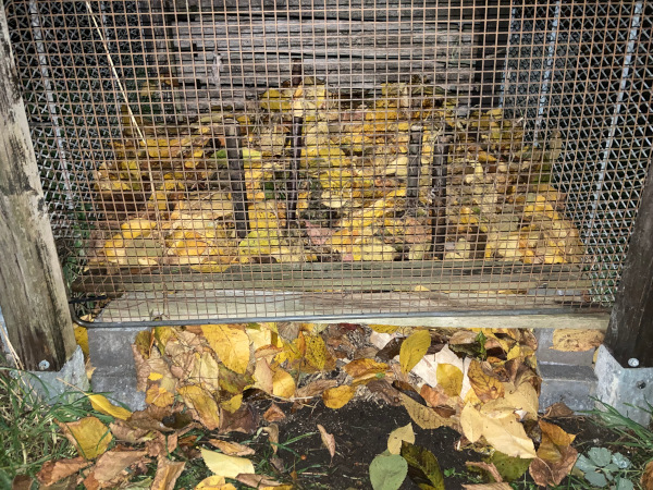 Damit das Laub nicht herausfallen kann, verschließe ich die Kompostlege provisorisch mit dem Kompostsieb. In den nächsten Tagen werde ich ein Gitter mit einer Handbreit Abstand zum Boden anbringen und dann die Lege nach und nach mit trockenem Laub auffüllen.