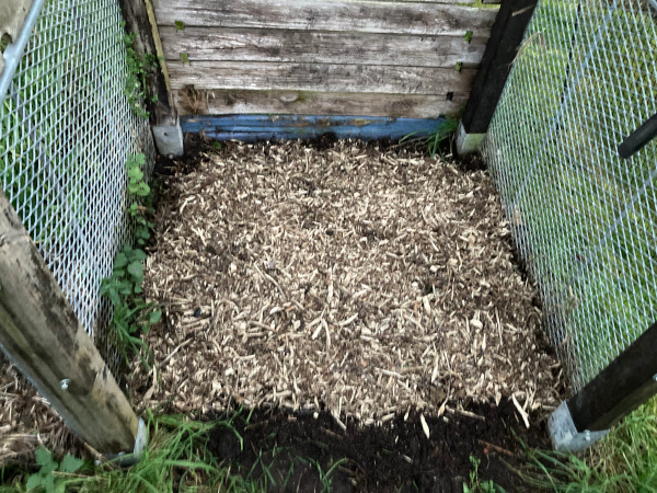 In jedem Fall will ich ihnen aber eine gute Überwinterungsmöglichkeit zur Verfügung stellen. Eine meiner Kompostlegen ist fast leer. Ich habe sie komplett ausgeleert und den Kompost auf ein Beet verteilt. Den Boden habe ich in der Mitte leicht erhöht gelassen und an den Rändern kleine Abzugsgräben gezogen, damit sich kein Wasser unter dem Igelnest sammeln kann. Dann geht es los.