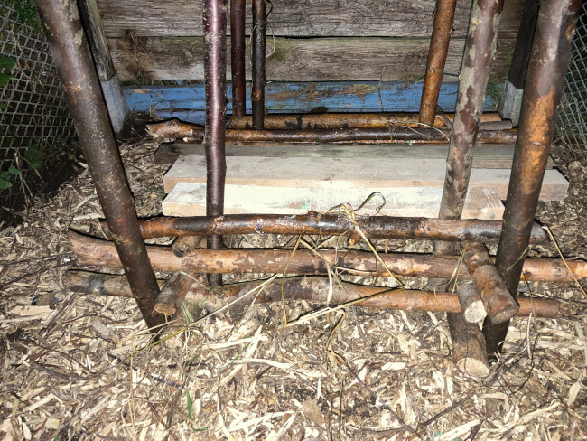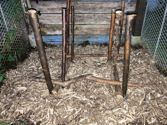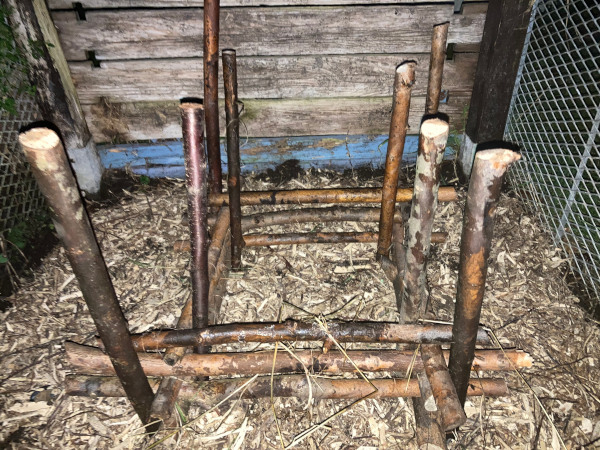Zuunterst kommt eine Schicht Holzhäcksel zur Isolierung. Dann lege ich vier Äste wie ein Blockhaus aus und schlage innerhalb und außerhalb der Kreuzungspunkte je einen Ast ein.