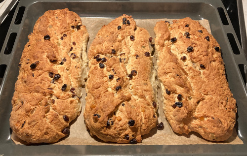 Die Früchte knete ich von Hand unter. Die Stollen lassen sich gut formen, zerlaufen im Ofen aber ziemlich. Jetzt wird der noch heiße Stollen großzügig mit zerlassener Butter bepinselt. Nach der dritten Schicht bleibt genug Butter auf der Oberfläche stehen, dass ich ihn mit Zucker und etwas Vanillezucker bestreuen kann. Butter und Zucker bilden eine Schicht, die den Stollen am austrocknen hindert. Zu spät fällt mir ein, dass ich auch die Unterseite hätte buttern müssen. Egal, ich gehe ohnehin davon aus, dass der Stollen dieses Jahr eher eine Shortbread-Konsistenz haben wird.