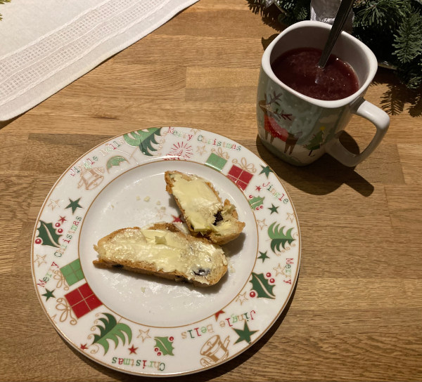 Ich kann mich nicht zurückhalten und probiere einen kleinen Kanten, bevor ich meine Stollen einpacke. Lecker, aber zu trocken.Was habe ich auch erwartet?! Egal, kommt beim Essen noch mehr Butter drauf, und im Notfall wird getunkt. Ein bisschen enttäuscht bin ich trotzdem und hoffe auf ein Stollenwunder. Er muss nämlich noch eine Woche liegen, um durchzuziehen.