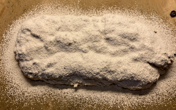 Am nächsten Tag wird er dick mit Puderzucker eingestäubt. Statt zwei kleinen sind durch meine „Rezepterweiterung“ drei mittlere Stollen entstanden, sie werden in Frischhaltefolie und Alufolie verpackt und einer macht sich gleich auf die Reise zur Schwester.