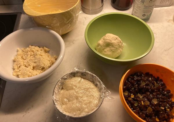 Alles fing ganz harmlos an, ich wollte das Rezept für den Erzgebirge-Weihnachststollen von Lutz Geißler nachbacken. Der verwendet ein Mehlkochstück, das ist so etwas wie ein Brandteig, der sehr viel Flüssigkeit speichern kann und den Stollen schön saftig macht. Das Mehlkochstück wird am Vortag angesetzt, ebenso die Trockenfrüchte, die in Rum eingelegt werden. Auch die Butter wird am Tag zuvor mit Zucker und den Gewürzen vermischt, das ist sinnvoll, denn so können sich die ätherischen Öle gut verteilen. Und ein kleiner Vorteig mit wenig Hefe, der lange reift, das kenne ich schon von den Sonntagsbrötchen.